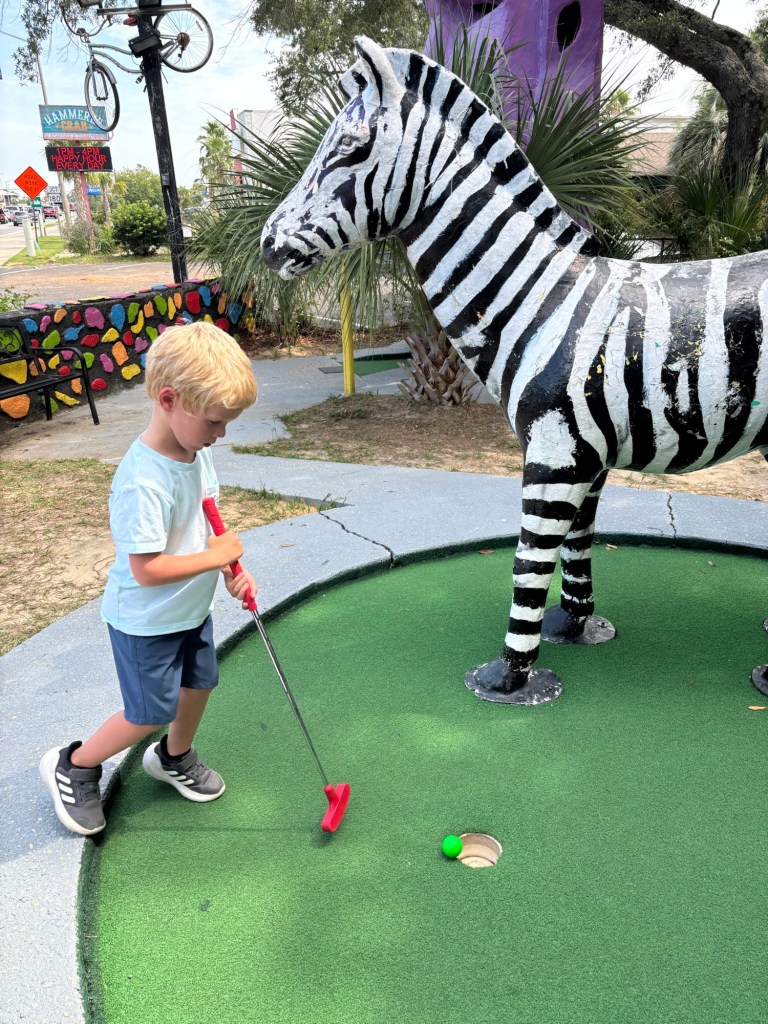 - Zooland Mini Golf: kids play for $5 and adults for $10. We went to this one during the day because it is under big trees so mostly shaded.